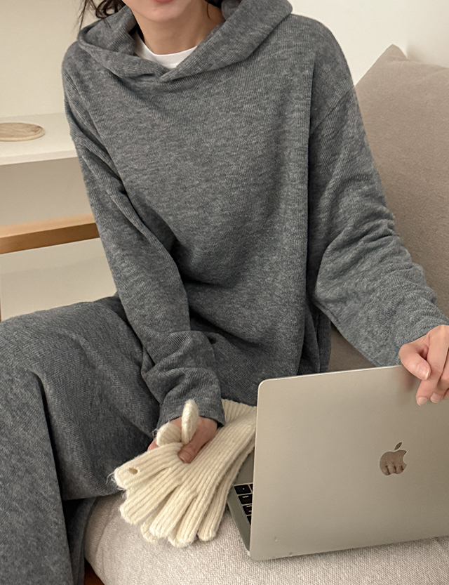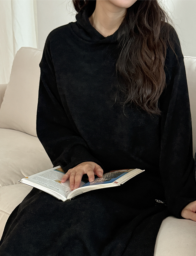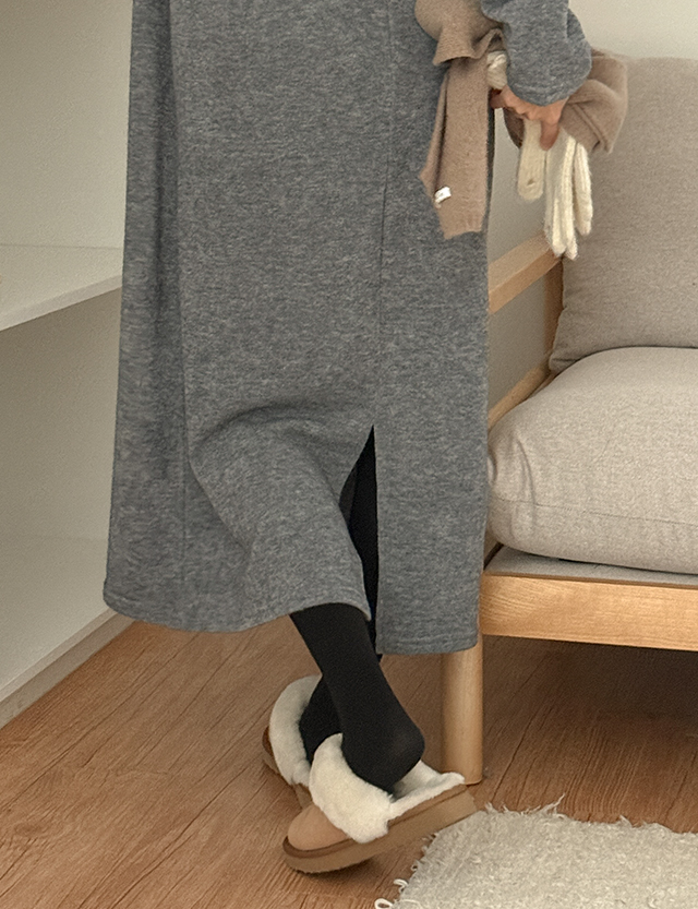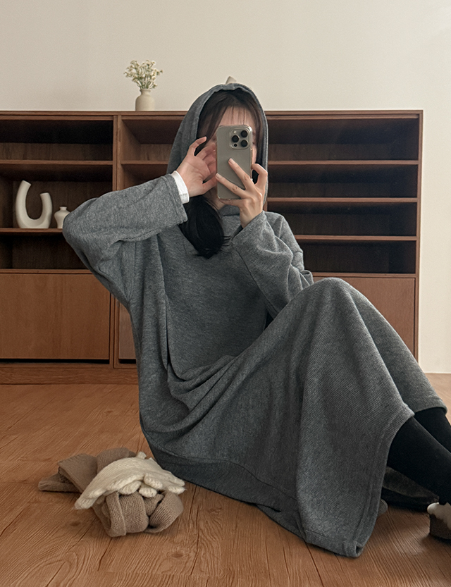 니트같은 소재로 제작된 골지 후드 롱 원피스