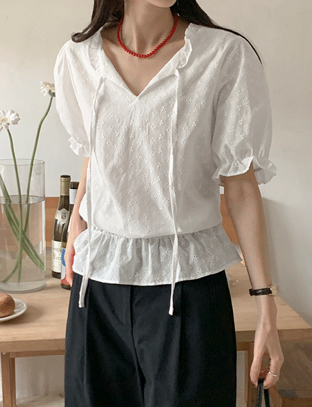 [러블리룩] 블리블리미 Race Punching 밑단 Freel Short-sleeve Blouse 87172